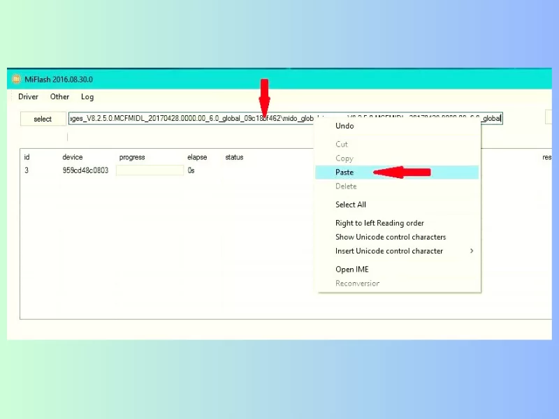 7. Return to the MiFlash app and paste the path in the section right next to the select option.